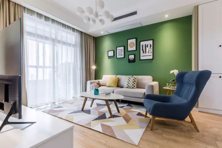 绿色的背景墙特别的抢眼,搭配米色沙发,简约清爽由然而生。