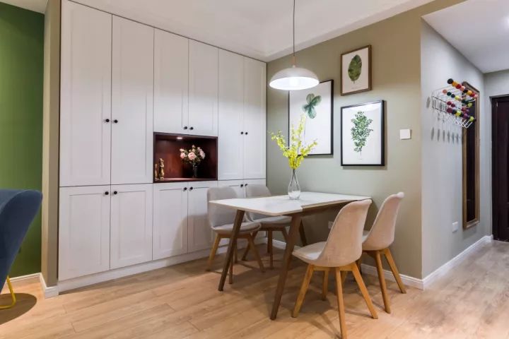 餐厅背景是一面墙的定制收纳柜,中间留空,摆个花瓶,或装饰品,更有品位!