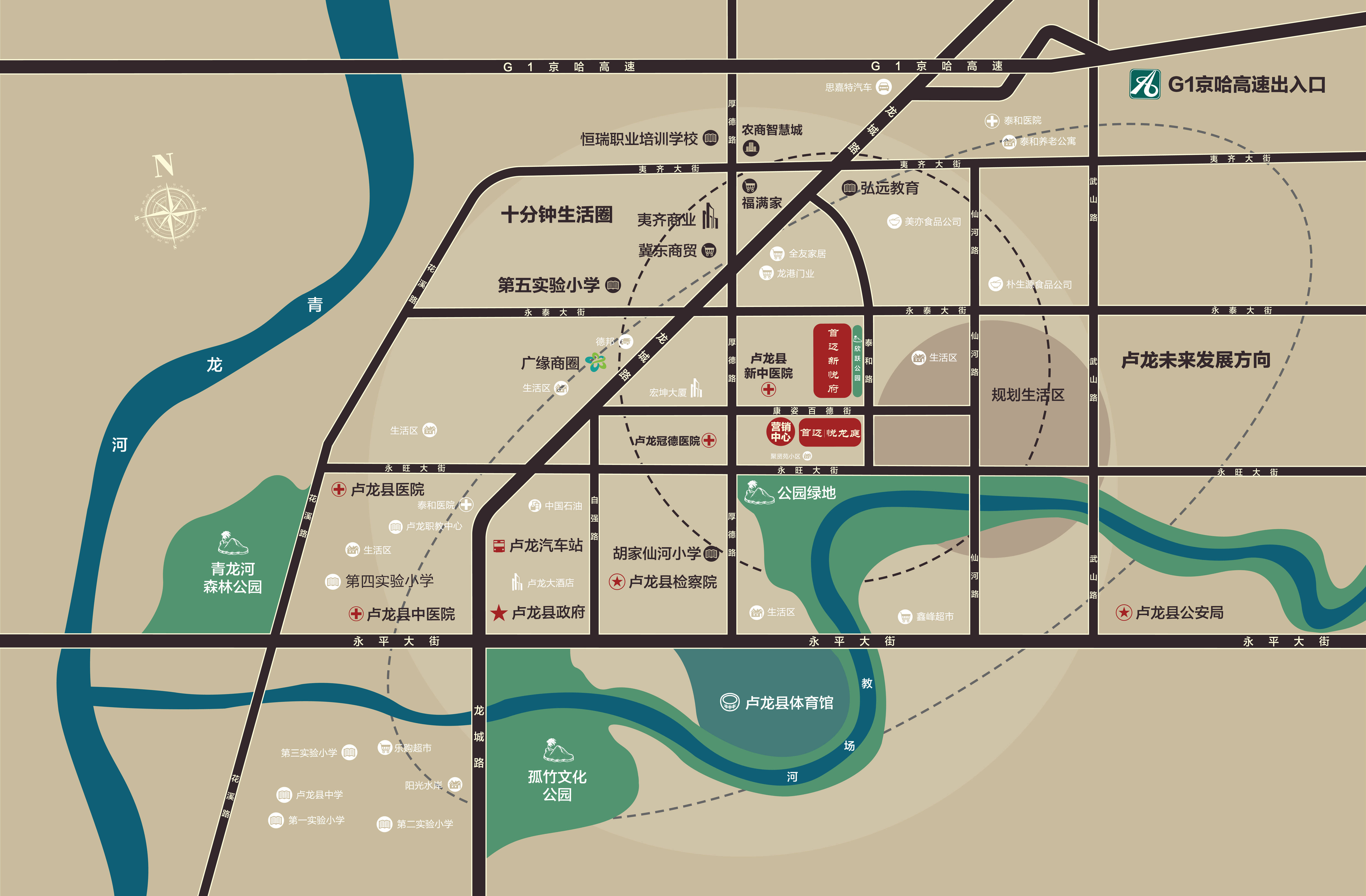 生活配套:项目紧邻“欣悦公园”,是卢龙县唯一一个体育运动主题公园; 交通配套:距京哈高速卢龙出口1.5公里,卢龙汽车站1.8公里,距离广缘百货商城1.5公里; 教育配套:项目西侧紧邻规划待建的卢龙县第六小学,周边有春天幼儿园、金帝幼儿园、第五实验小学、弘远私立学校(弘远教育)、职教中心、第二高级中学等。 医疗配套:项目西侧中西康养医院,冠德医院、建设中的中医医院,为小区业主的生活保驾护航。 商业配套:项目西行5分钟就是卢龙最大的广缘百货,北行3分钟福满家综合购物广场。