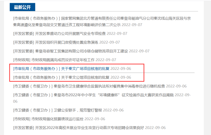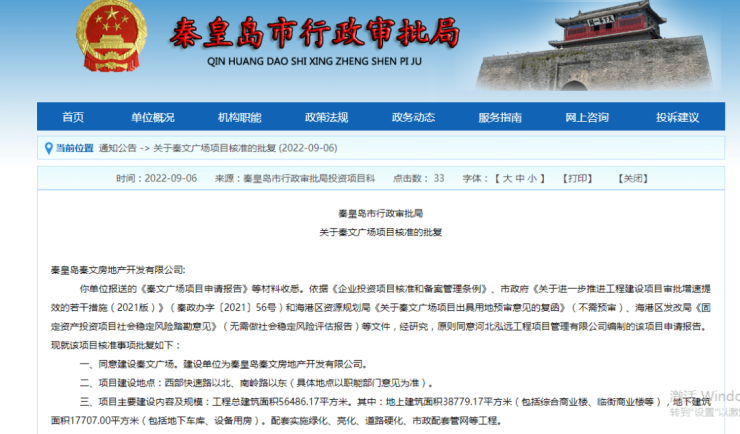 昨日,秦皇岛市政府网站发布关于秦文广场及秦文公馆项目核准的批复。