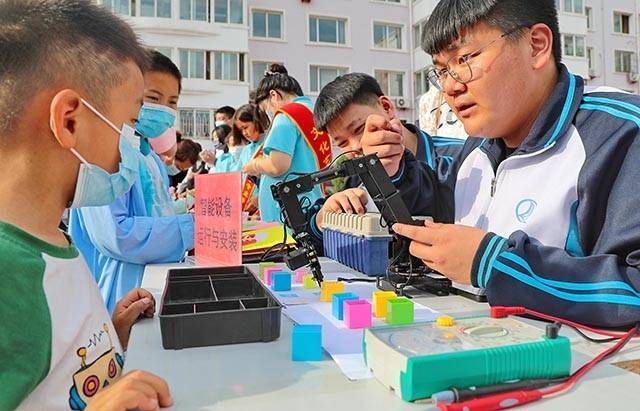 秦皇岛市中等专业学校学生为小朋友讲解智能设备运行与安装。曹建雄 摄