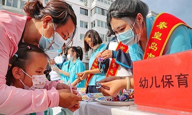 秦皇岛市中等专业学校学生为居民展示手工制作作品。曹建雄 摄
