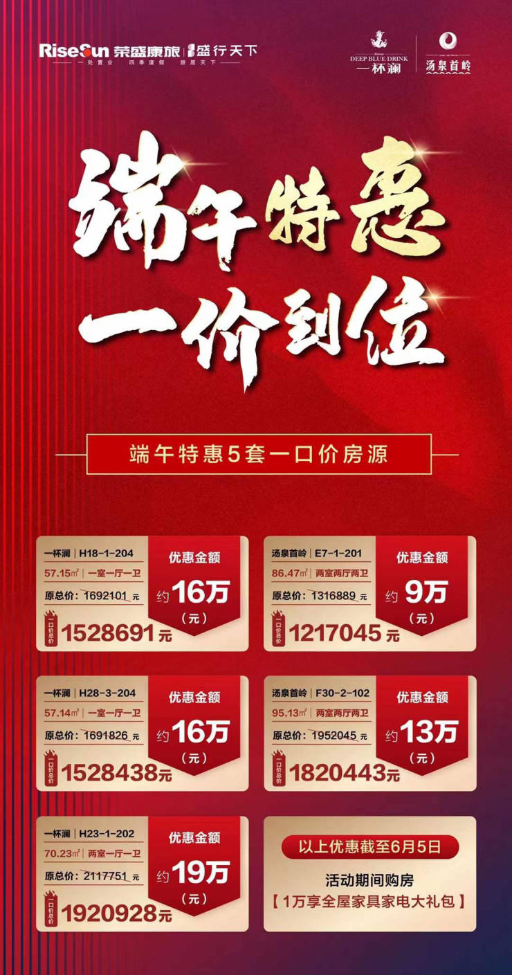 荣盛地产端午期间推出5套特惠房,分布于汤泉首岭和一杯澜两个项目,优惠力度从9万到19万不等,其中一杯澜H23-1-202,户型面积70.23平米两居,优惠金额达19万。