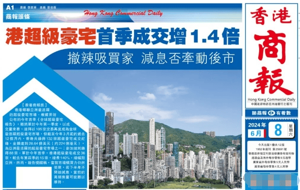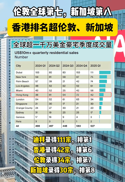 今年一季度,全球价格逾千万美元(约合7800万港元)的超级豪宅成交527宗,香港成交42宗,环比去年四季度成交量激增140%,排名全球第六,增幅居亚洲之首。