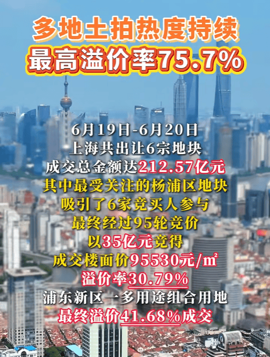6月24日,上海5宗地块扎堆出让,4宗溢价成交、1宗底价成交,总成交金额191.57亿元。其中,位于市中芯杨浦区地块吸引了6家竞买人参与,经过95轮竞价,由保利发展以35亿元竞得,成交楼面价95530元/㎡,溢价率30.79%。