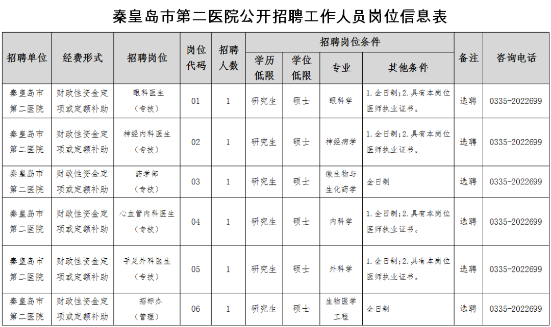 (二)岗位要求秦皇岛市第二医院公开招聘工作人员岗位要求详见《秦皇岛市第二医院公开招聘工作人员岗位信息表》(附件1)。