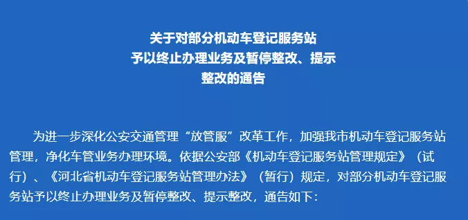 为进一步深化公安交通管理“放管服”改革工作,加强我市机动车登记服务站管理,净化车管业务办理环境。依据公安部《机动车登记服务站管理规定》(试行)、《河北省机动车登记服务站管理办法》(暂行)规定,对部分机动车登记服务站予以终止办理业务及暂停整改、提示整改,通告如下: