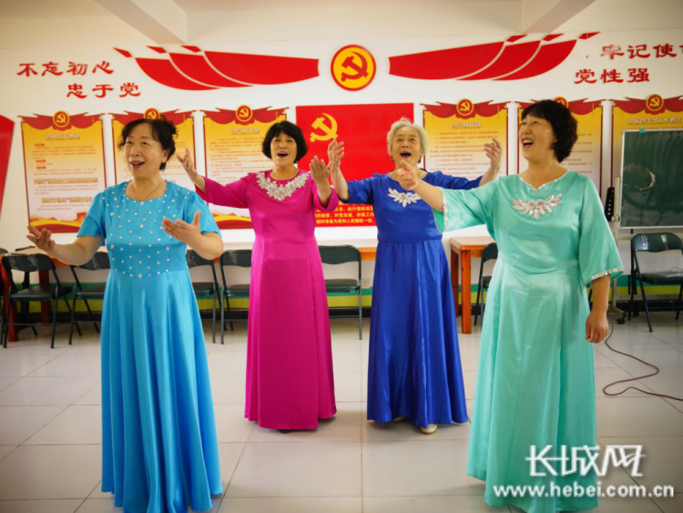 华苑社区老人在活动室内表演唱歌。
