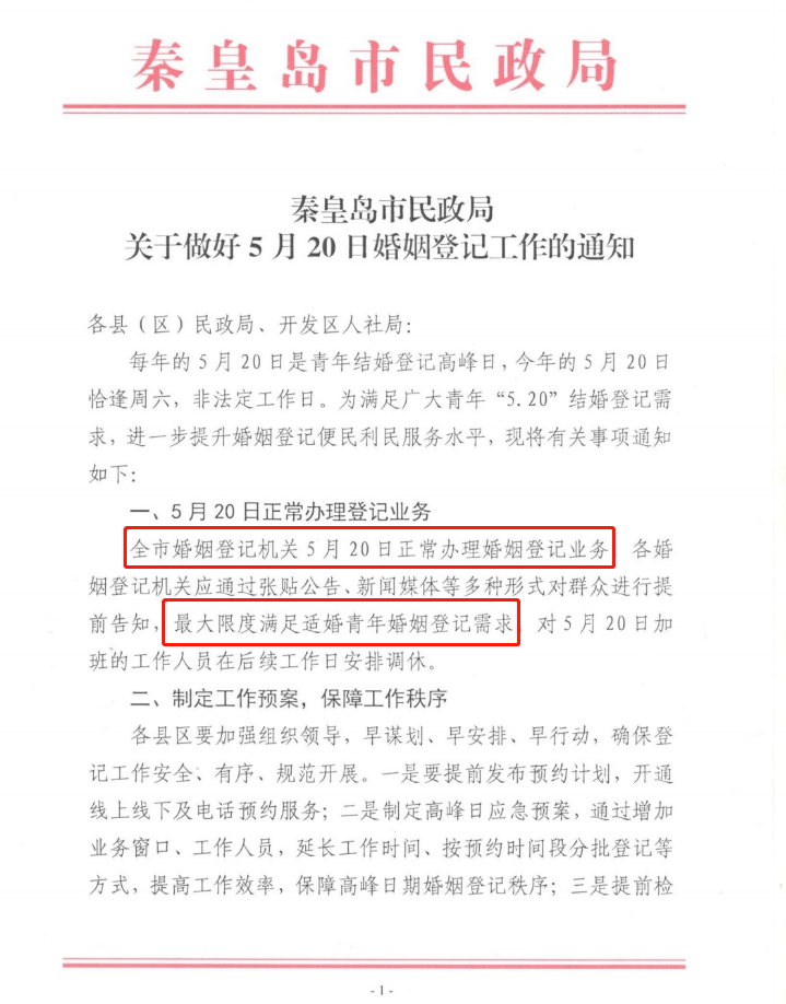 全市婚姻登记机关,5月20日正常办理婚姻登记业务!最大限度满足适婚青年结婚登记需求。
