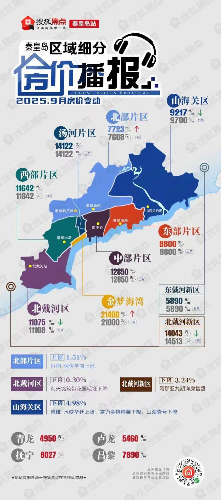 北戴河区(均价11075元/㎡)环比下跌0.30%