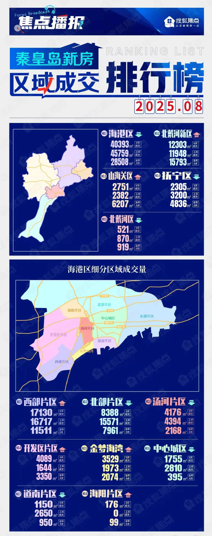 下跌区域:海港区成交面积约为4.04万㎡,环比减少11.73%;北戴河区成交面积约为0.05万㎡,环比减少40.11%;抚宁区成交面积约为0.23万㎡,环比减少27.97%。