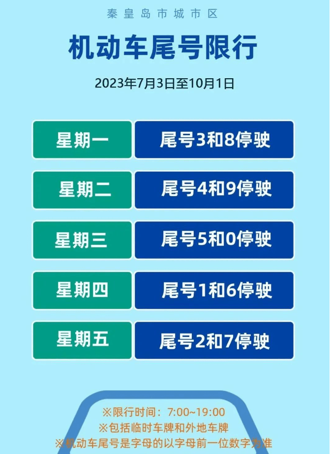 7月3日至10月1日,我市开启新一轮尾号限行,限行时间为周一至周五(不含法定节假日、周六、周日)。星期一限行3和8,星期二限行4和9,星期三限行5和0,星期四限行1和6,星期五限行2和7。北戴河区同步实施限行措施。