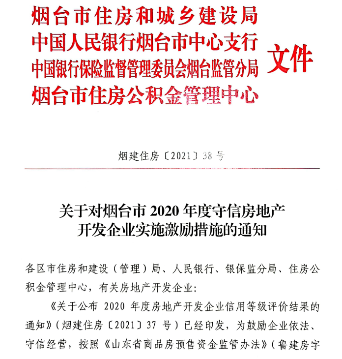 烟台住建局通知明确,将按照《山东省商品房预售资金监管办法》等规定,对守信企业落实相应激励措施。对信用等级为AAA级开发企业,商品房预售监管资金留存比例降低5个百分点;对信用等级为AA级开发企业,商品房预售监管资金留存比例降低3个百分点。上述3%-5%的预售资金监管解除后,须优先用于农民工工资支付。