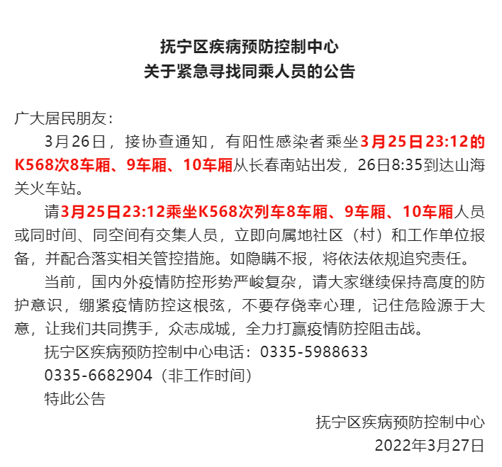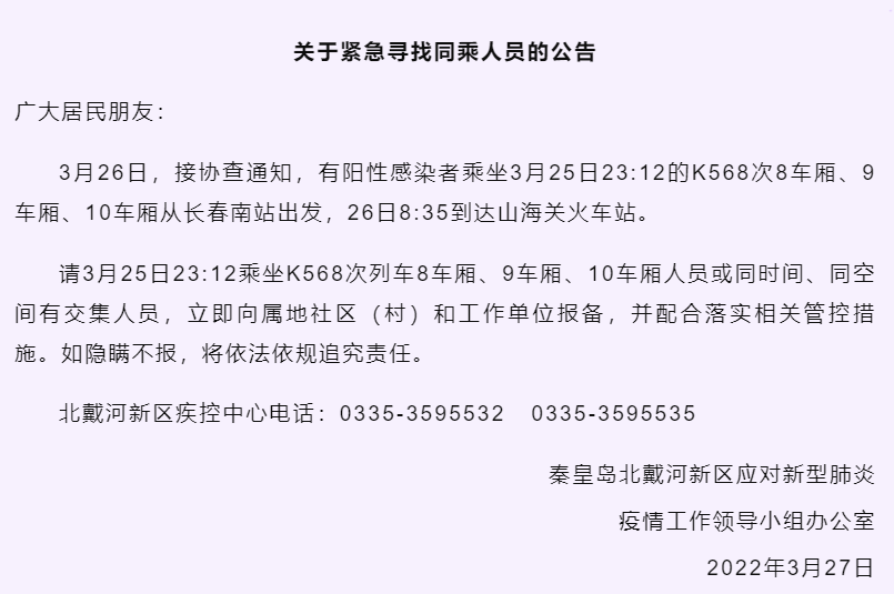 3月26日,接协查通知,有阳性感染者乘坐3月25日23:12的K568次8车厢、9车厢、10车厢从长春南站出发,26日8:35到达山海关火车站。
