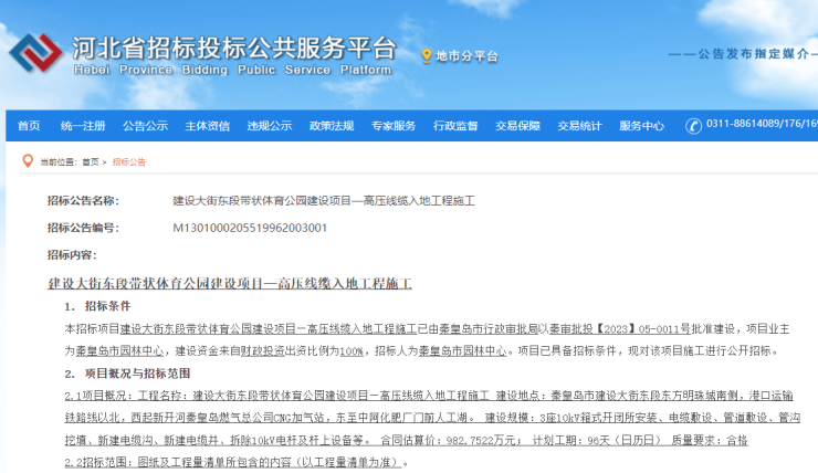 9月13日,河北省招标投标公共服务平台网站公布,秦皇岛市将在建设大街东段建一条带状体育公园。工程名称:建设大街东段带状体育公园建设项目—高压线缆入地工程施工建设地点:秦皇岛市建设大街东段东方明珠城南侧,港口运…