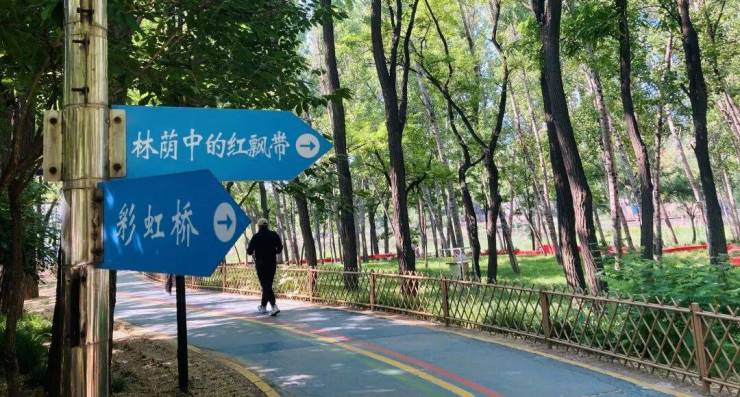 600多米红色“飘带”沿汤河蜿蜒,串联起步道、健身区与观景台,是全家人的天然休闲胜地。