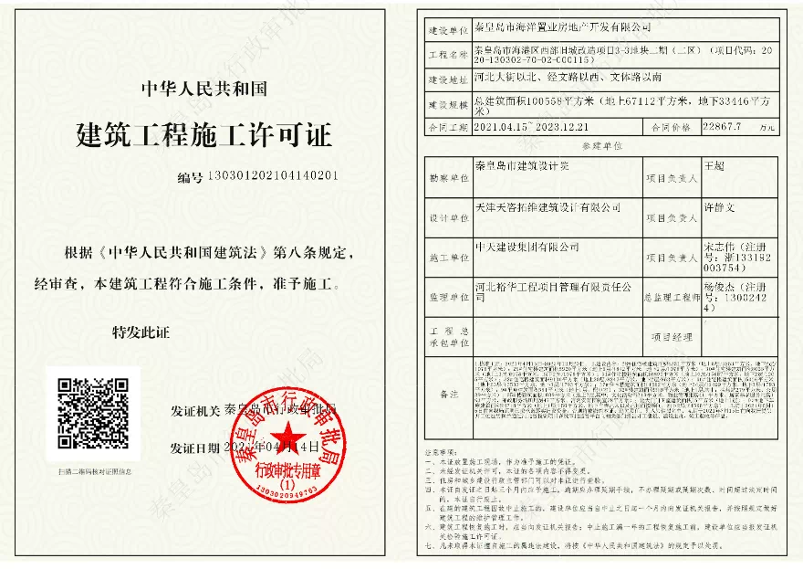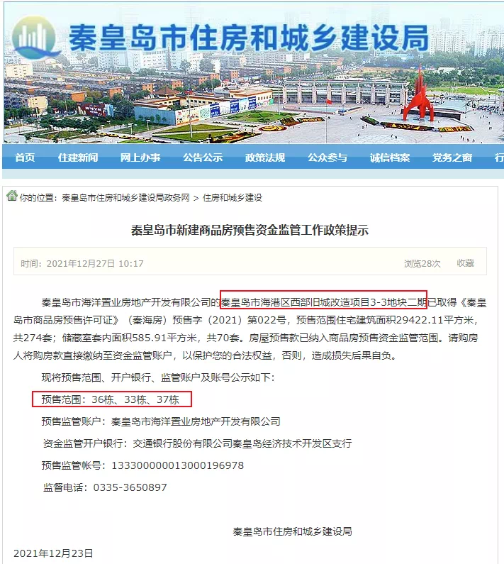 近日,秦皇岛市住房和城乡建设局发出12月第三张新建商品房预售证,详情如下: