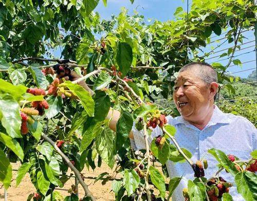 沿着曲折蜿蜒的山径,拾级而上,见到景区负责人杨树贵时,他正忙着打理自己精心培植的桑葚树,摘下一颗颗成熟紫红的果子,这是酿制果酒的好食材。