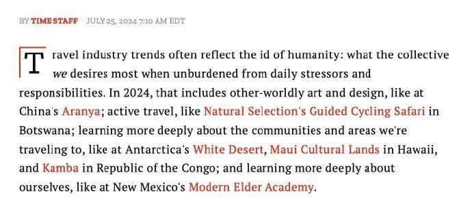 为了编制2024年的榜单,《时代周刊》从其国际通讯员和撰稿人网络、自申请渠道中征集了包括酒店、游轮、餐馆、景点、博物馆、公园等地的提名地点,重点关注那些提供新颖和令人兴奋体验的地方。