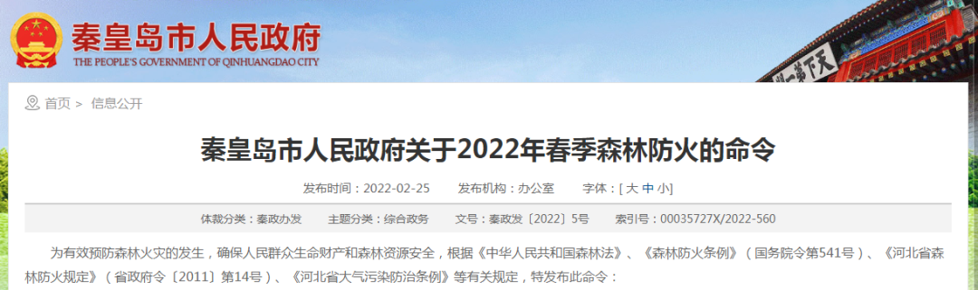 秦皇岛市人民政府关于2022年春季森林防火的命令