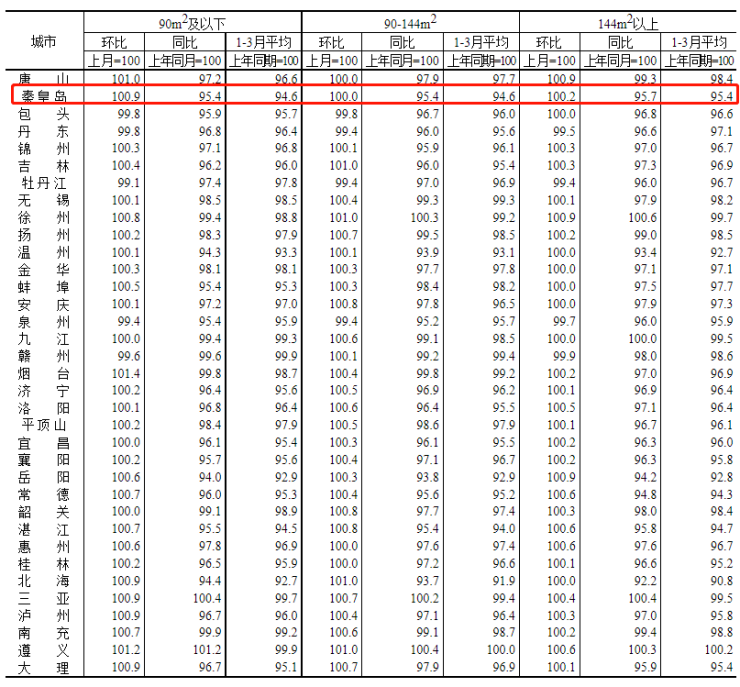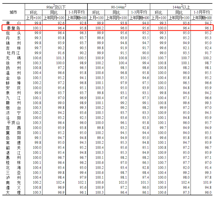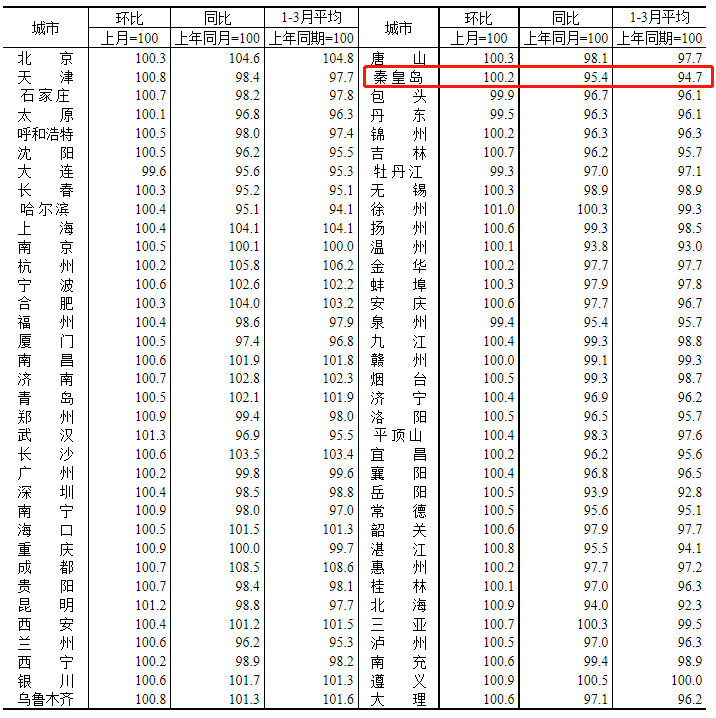 数据显示,3月份秦皇岛新建商品住宅价格环比上浮0.2%,同比下跌4.6%;二手住宅价格环比上浮0.2%,同比下跌3.8%。
