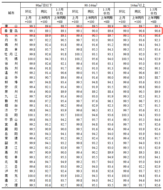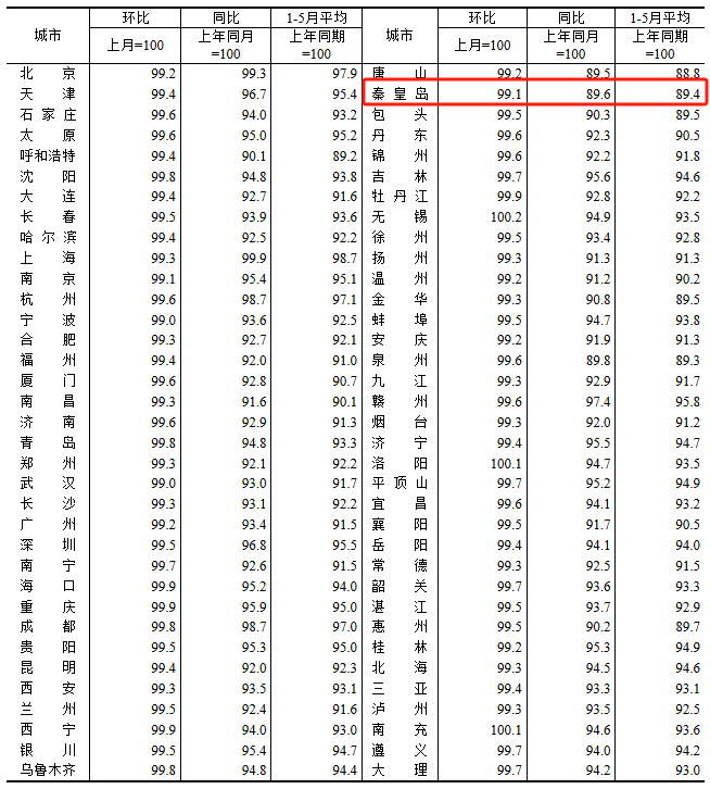 根据国家统计局数据,秦皇岛5月新房与二手房房价依然处于下跌水平,且跌幅均有所扩大,房价继续触底。