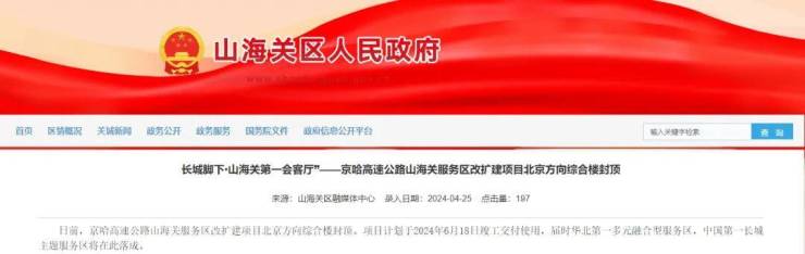 日前,京哈高速公路山海关服务区改扩建项目北京方向综合楼封顶。项目计划于2024年6月18日竣工交付使用,届时华北第一多元融合型服务区,中国第一长城主题服务区将在此落成。