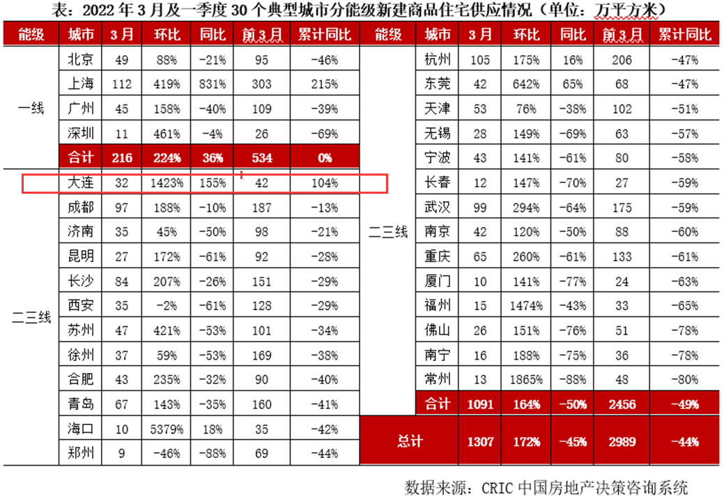 虽然销售端受阻,但大连市场供应端仍比较活跃。中指研究院统计显示,2022年1-2月大连商品房合计供应62万平方米,同比上涨77.7%,商品住宅合计供应11万平方米,同比下降27.7%。其中2月商品住宅供应2.1万平方米,环比下降76%,同比下降81%。另据克而瑞统计,3月以来,大连已有32万平方米新房入市,环比增加了1423%。