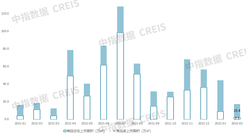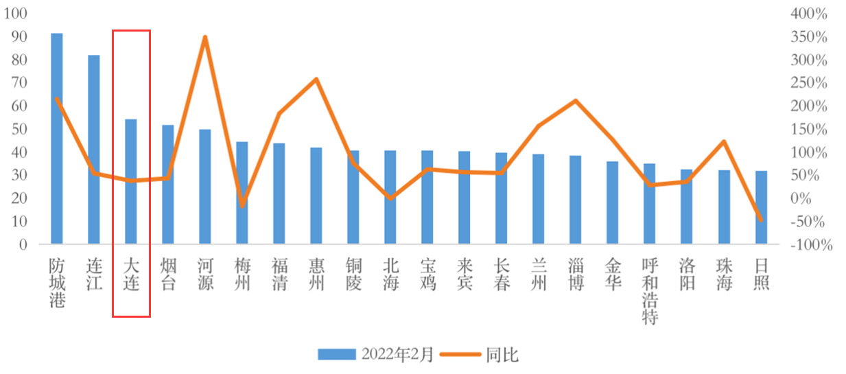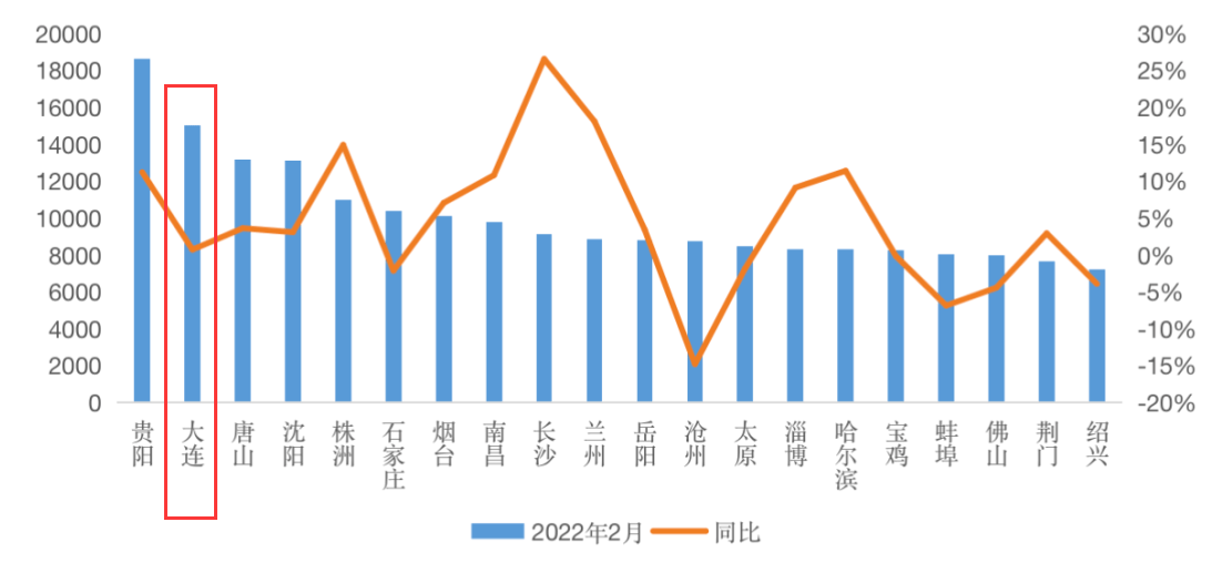2021年1月-2022年2月大连市商品房和商品住宅供应情况 来源:中指研究院