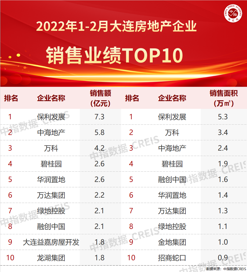 另据中指研究院统计,今年1-2月,大连销售金额TOP10企业合计销售金额为32.5亿元,销售面积TOP10企业合计销售面积20.4万平方米。从榜单上可以发现,头部房企的表现依然抢眼,保利、中海、万科以7.3亿元、5.8亿元和4.2亿元排在前三位,碧桂园、华润、万达、绿地和融创的销售额均超过2亿元。