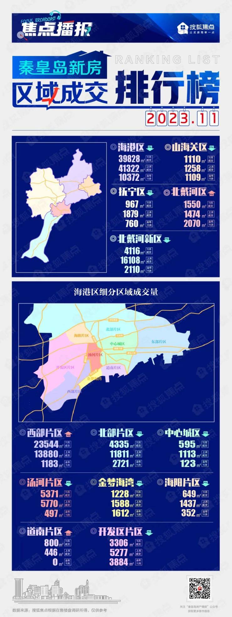其中,北戴河区11月新房成交面积约1550㎡,环比上浮5.16%;海港区10月新房成交面积共计约3.98万㎡,环比下跌3.62%。
