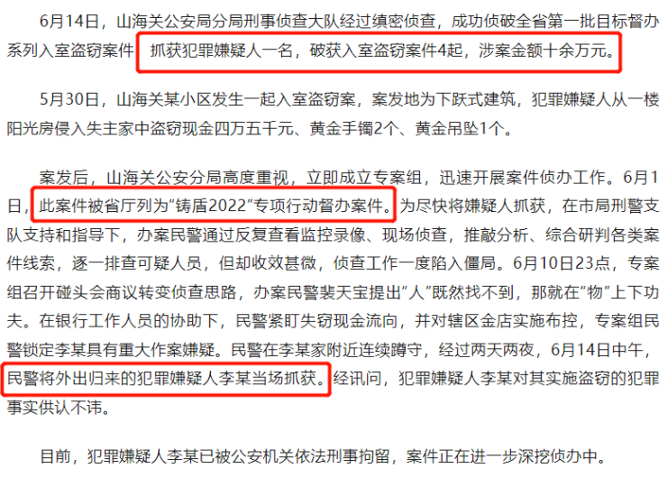 山海关公安分局成功侦破一起省督系列入室盗窃案件。