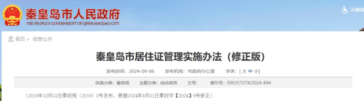 9月6日,秦皇岛市人民政府官网发布《秦皇岛市居住证管理实施办法(修正版)》该办法自印发之日起施行,有效期五年。