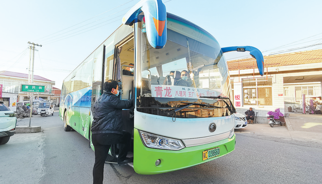 图为青龙满族自治县八道河镇八道河村客运改成公交车,班次增至40班,村民出行更便捷。这是村民坐公交车进城。河北日报记者师源摄