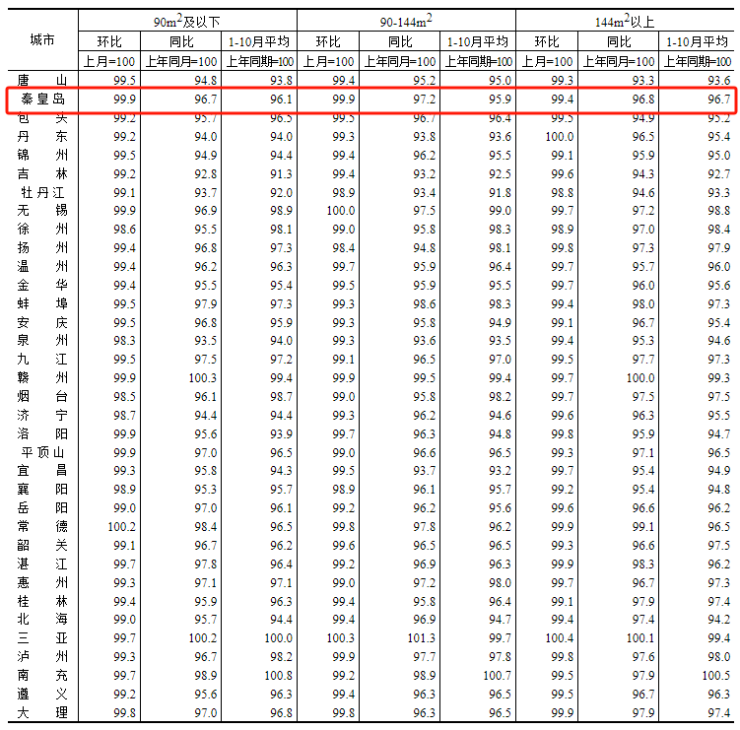 数据显示,10月份秦皇岛新建商品住宅价格环比下跌0.1%,同比下跌2.9%;二手住宅价格环比下跌0.2%,同比下跌3.1%。