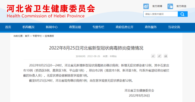2022年8月25日0—24时,河北省无新增新型冠状病毒肺炎确诊病例;新增无症状感染者12例,其中石家庄市10例(桥西区8例、鹿泉区1例、平山县1例),邢台市2例(南宫市1例、新河县1例,均系外省途经邢台被拦截的协查人员)。无症状感染者解除医学观察1例。