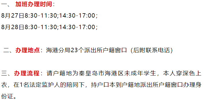 鉴于目前秦皇岛市未成年学生办理身份证需求激增,考虑到学生临近开学,本着全心全意为人民服务的原则,秦皇岛市公安局海港分局各派出所户籍窗口将于8月27日、28日加班为学生办理身份证。