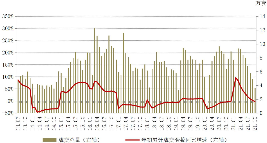 易居研究院监测的13个热点城市,10月二手房成交量约为3.6万套,环比大降26.9%,同比大幅下降42.8%;同时,1-10月成交量同比增速年内首次转负至-2.1%。截至10月底,13个重点城市二手房成交总量已基本回落至2014年10月的水平,这也意味着自2015年以来的二手楼市上升大行情宣告结束。