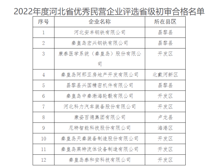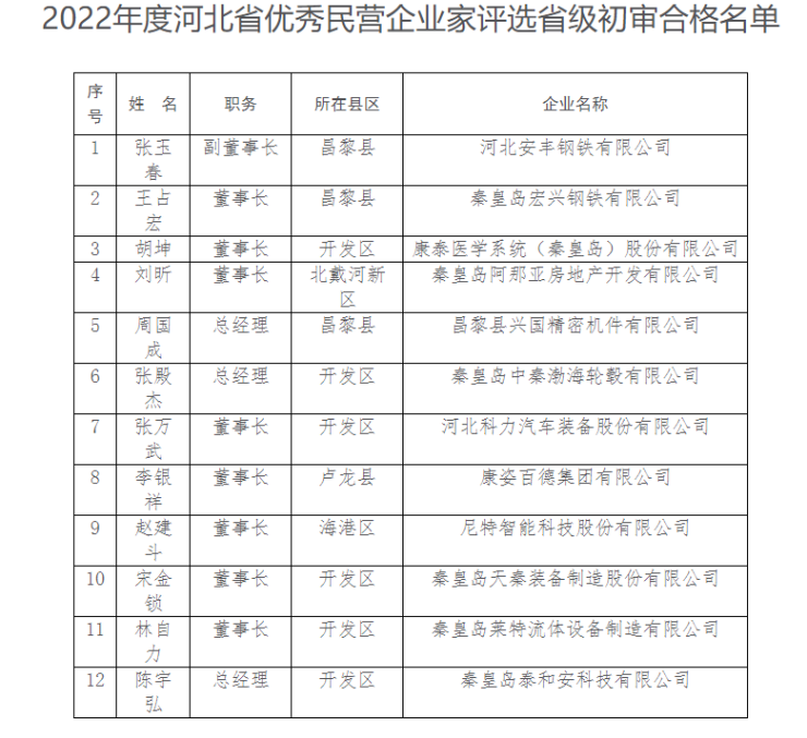 秦皇岛市2022年度河北省优秀民营企业和优秀民营企业家省级初审合格名单的公示