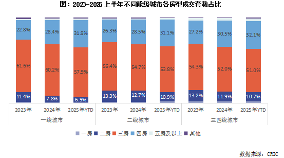 2025 年上半年,四房成交套数占比达到 31.6%,同比增加2.2%;五房小幅上升0.4%。