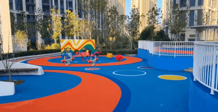 穿越重重风景,眼前豁然开朗,配色惊艳且柔和的儿童游乐场映入眼帘,富有高低差的装置结合滑梯、沙坑、互动游乐设施等,兼具美观与实用性,这里不仅是小朋友们的玩乐空间,也是大人们的童梦天地。