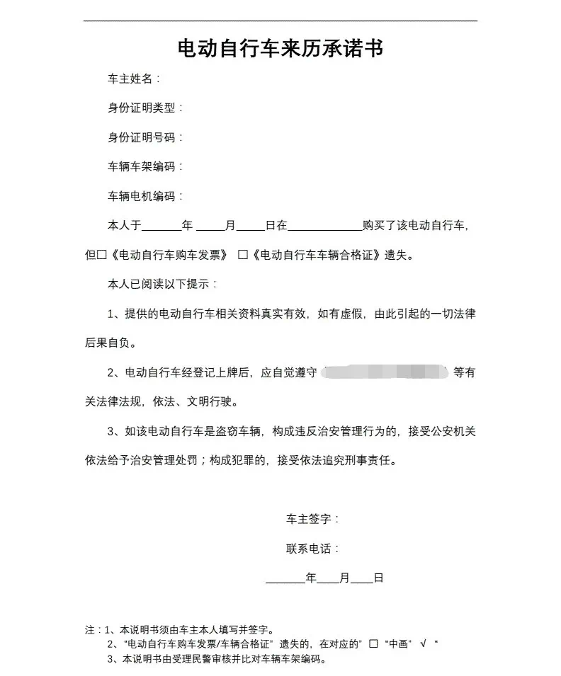 依照条例申请发放临时号牌,但无法提供电动自行车购车凭证或者其他来历证明的,由电动自行车所有人签署《电动自行车来历承诺书》后予以办理登记。
