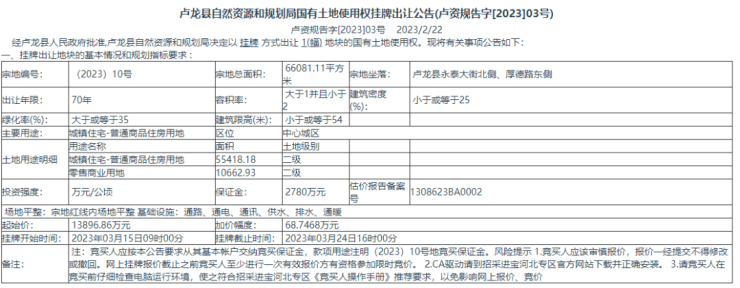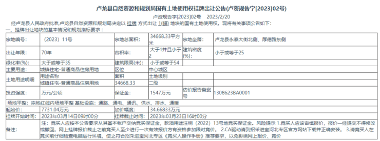 挂牌时间:2023年03月15日09时00分-2023年03月24日16时00分