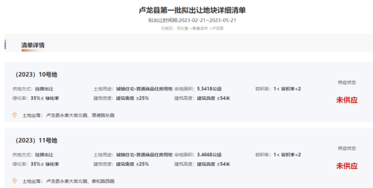 近日,中国土地市场网发布两则拟出让地块详细清单,涉及海港区和卢龙县,共计5宗商住用地将于3月底挂牌出让。