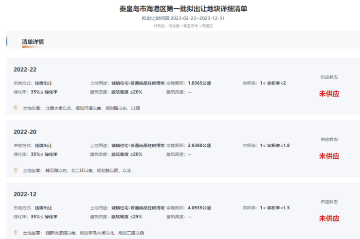 备注:本次挂牌出让的3宗地块详细资料和具体要求,见挂牌出让文件。申请人可于 2023年02月27日至2023年03月22日到秦皇岛市海港区自然资源和规划局自然资源开发利用股 获取挂牌出让文件。
