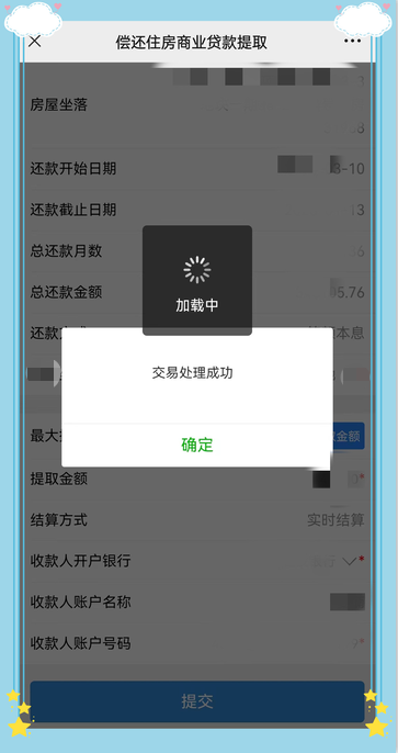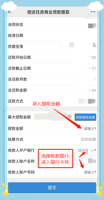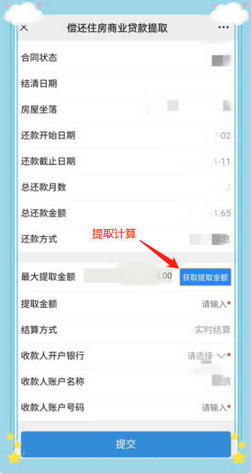 点击【获取提取金额】按钮,反显最大提取金额信息,录入本次提取金额(录入的提取金额不得大于界面反显的最大提取金额),选择收款银行,录入银行卡号,确认无误后,点击【提交】按钮,系统校验无误后,完成本次商贷提取,资金即时到账。