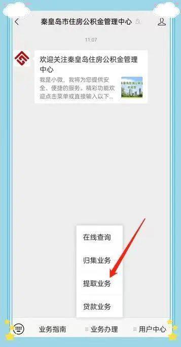 进入秦皇岛公积金官方微信公众号,找到底侧菜单--【业务办理】--【提取业务】--【偿还住房商业贷款提取】,点击后进入偿还住房商业贷款提取业务界面;