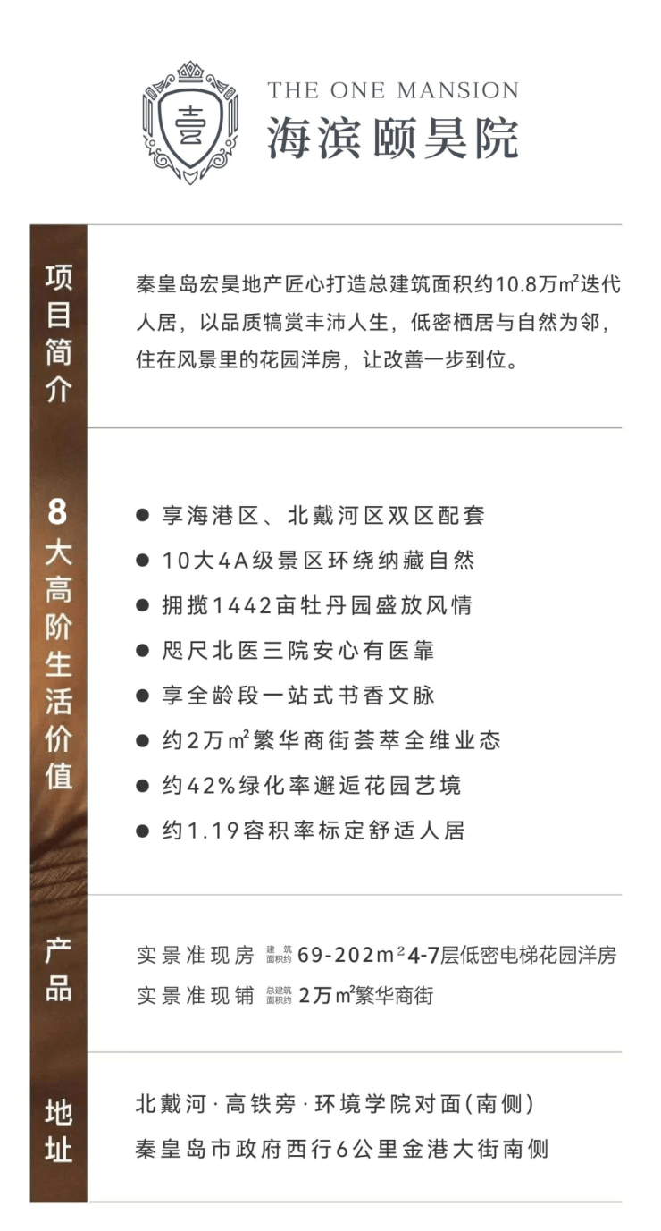 海滨颐昊院将国际化大都市生活样本为坐标,以“4-7层低密电梯花园洋房+高校旁288m繁华商街”赋能北戴河人居生活及城市配套发展,以2万㎡的欧式公园住境树立洋房生活的新典范。外观京津冀景区级牡丹园、丰沛北戴河旅游度假资源,内拥公园住区、低密洋房、繁华商业街区,凭借“居+境+景+游+商”生态人居模式,缔造北戴河理想休闲度假生活区。
