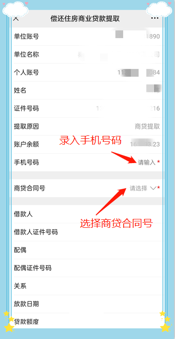 录入11位手机号码,点击【商贷合同号】选项,选择其中的一笔合同号,系统自动查询及反显该笔合同号的商贷基本信息及还款信息;