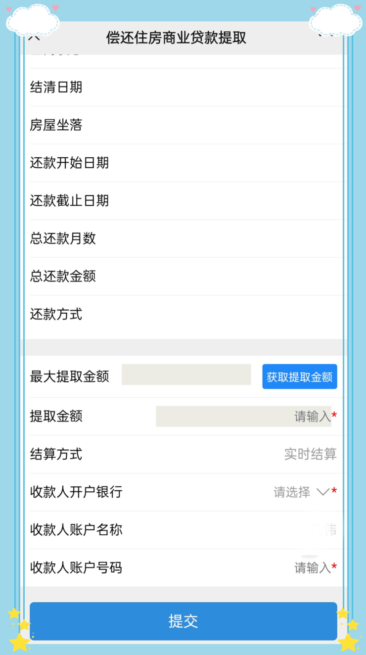 录入本次提取金额(录入的提取金额不得大于界面反显的最大提取金额),选择收款银行,录入银行卡号,确认无误后,点击【提交】按钮,系统校验无误后,完成本次商贷提取。提取完成后,注意查收相关银行的收款入账短信等动账消息提醒。